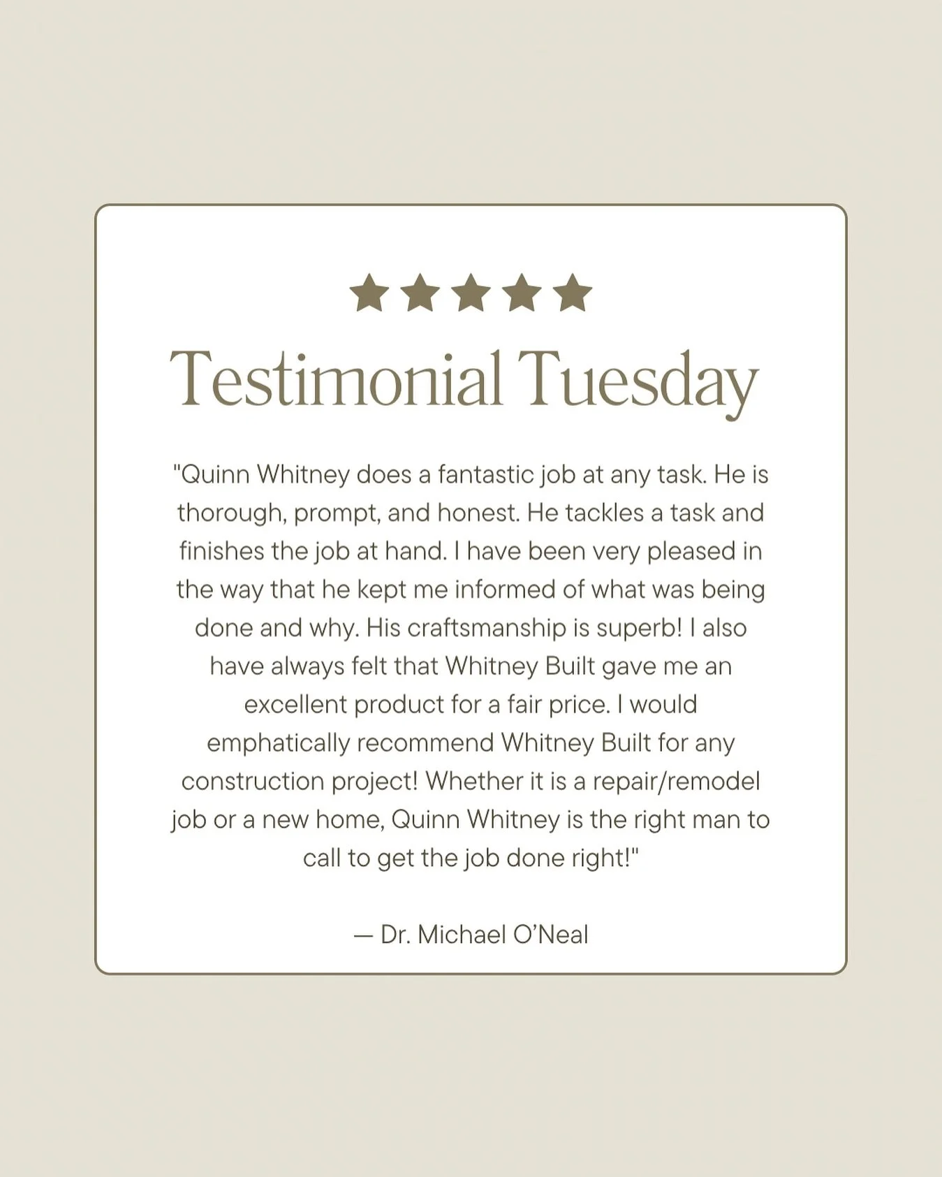 "Quinn Whitney does a fantastic job at any task. He is thorough, prompt, and honest. He tackles a task and finishes the job at hand. I have been very pleased in the way that he kept me informed of what was being done and why. His craftsmanship is superb! I also have always felt that Whitney Built gave me an excellent product for a fair price. I would emphatically recommend Whitney Built for any construction project! Whether it is a repair/remodel job or a new home, Quinn Whitney is the right man to call to get the job done right!"